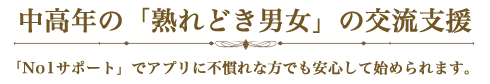 中高年向けのマッチングアプリなら「熟れドキ」熟年層にフォーカスしたアプリで、登録も操作もカンタン!また、24時間サポートも充実しているので、マッチングアプリが初めての方でも安心してご利用頂けます。